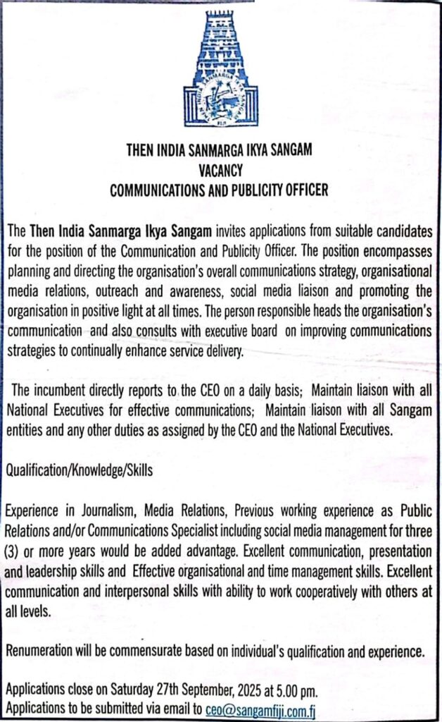 Organisation: Then India Sanmarga Ikya Sangam (TISI Sangam)Location: Fiji 📢 About the Role Then India Sanmarga Ikya Sangam invites applications from suitably qualified candidates for the position of Communications and Publicity Officer. This role is responsible for: The incumbent will: ✅ Qualifications, Knowledge & Skills 💼 Remuneration Remuneration will be commensurate with qualifications and experience. […]